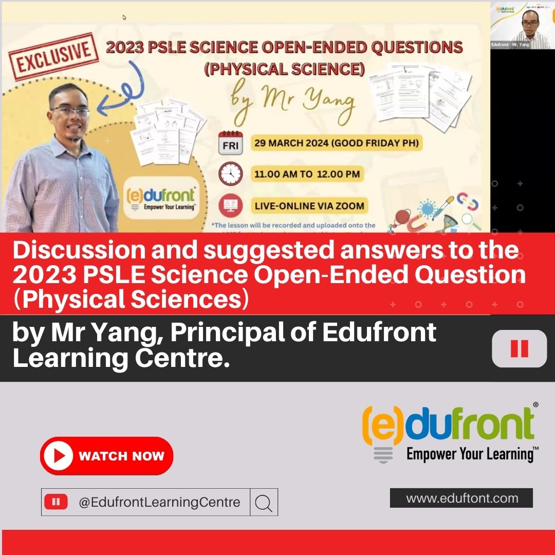 April 9, 2024 Discussion and suggested answers to the 2023 PSLE Science Open-Ended Question (Physical Sciences) by Mr Yang, Principal of Edufront Learning Centre. Read Article