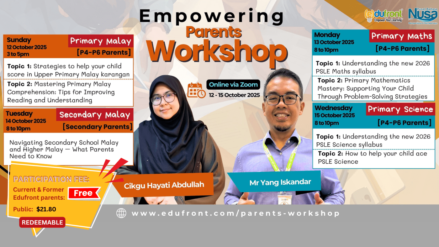 Navigating Secondary School Malay and Higher Malay – What Parents Need to Know: This workshop provides an overview of the latest syllabus changes and new exam formats for Secondary Malay and Higher Malay. Parents will gain insights into the updated learning objectives and key focus areas, along with practical strategies to support their child’s language development and academic success.